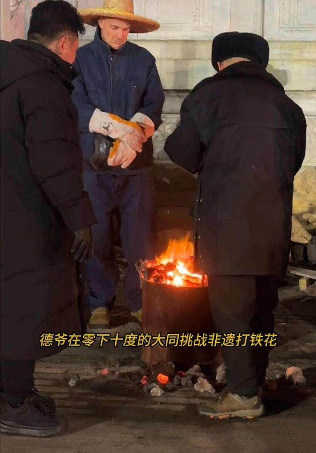 德爷在大同代王府学习并挑战非遗“打铁花”(图源:受访者)